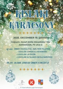 KISLAKI KARÁCSONY! Időpont: 2025. DECEMBER 19. (péntek) Helyszín: József Attila Művelődési Ház (Szőlőskislak, Fő utca 2.) 17.00 Ünnepi összeállítás, amelyben fellépnek: A Boglári zeneIskola növendékeI a BOGLÁRI JÁTÉKSZÍN a BOGLÁRI ÁLTALÁNOS ISKOLA NAPKÖZISEI 18.00 BLUMIK ZENEKAR ünnepi koncertje