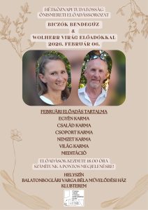 Folytatódik az önismereti előadássorozat! Időpont: 2026. február 06. (péntek) 18 óra Helyszín: Balatonboglári Varga Béla Városi Művelődési Ház - Klubterem Előadók: Biczók Bendegúz & Wolherr Virág FEBRUÁRI ELŐADÁS TARTALMA:Egyén karmaCsalád karmaCsoport karmaNemzet karmaVilág karmaMeditáció Szeretettel várunk minden kedves érdeklődőt!