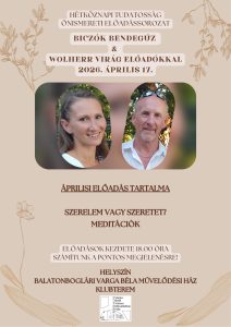 Szeretettel várunk minden kedves érdeklődőt a Hétköznapi Tudatosság Előadássorozat áprilisi programjára! Időpont: 2026. április 17. péntek 18.00 Helyszín: Balatonboglári Varga Béla Városi Művelődési Ház - Klubterem (Árpád u. 17.) Előadók: Wolherr Virág & Biczók Bendegúz Téma: Szerelem vagy szeretet? Meditációk