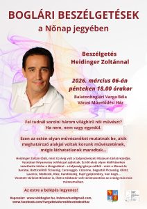 BOGLÁRI BESZÉLGETÉSEK A NŐNAP JEGYÉBEN HEIDINGER ZOLTÁNNAL! Időpont: 2026. március 06. (péntek) 18.00 óra Helyszín: Balatonboglári Varga Béla Városi Művelődési Ház Fel tudnál sorolni három világhírű női művészt? Ha nem, nem vagy egyedül. Ezen az estén olyan művésznőket mutatnak be, akik meghatározó alakjai voltak korunk művészetének, mégis láthatatlanok maradtak... Heidinger Zoltán több, mint tíz évig […]