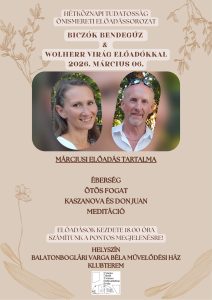 HÉTKÖZNAPI TUDATOSSÁG ÖNISMERETI ELŐADÁSSOROZAT ELŐADÓK: BICZÓK BENDEGÚZ & WOLHERR VIRÁG IDŐPONT: 2026. március 06. (péntek) 18.00 HELYSZÍN: BALATONBOGLÁRI VARGA BÉLA MŰVELŐDÉSI HÁZ -KLUBTEREM(8630 Balatonboglár, Árpád u. 17.) MÁRCIUSI ELŐADÁS TARTALMA:ÉberségÖtös fogatKaszanova és Don JuanMeditáció Szeretettel várunk minden kedves érdeklődőt!